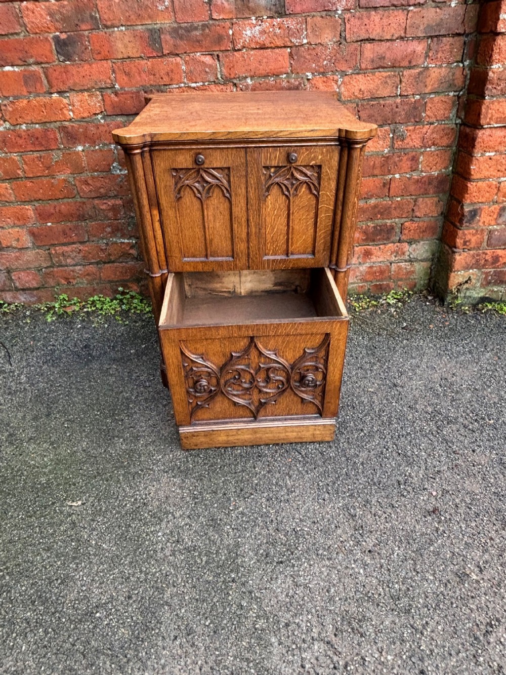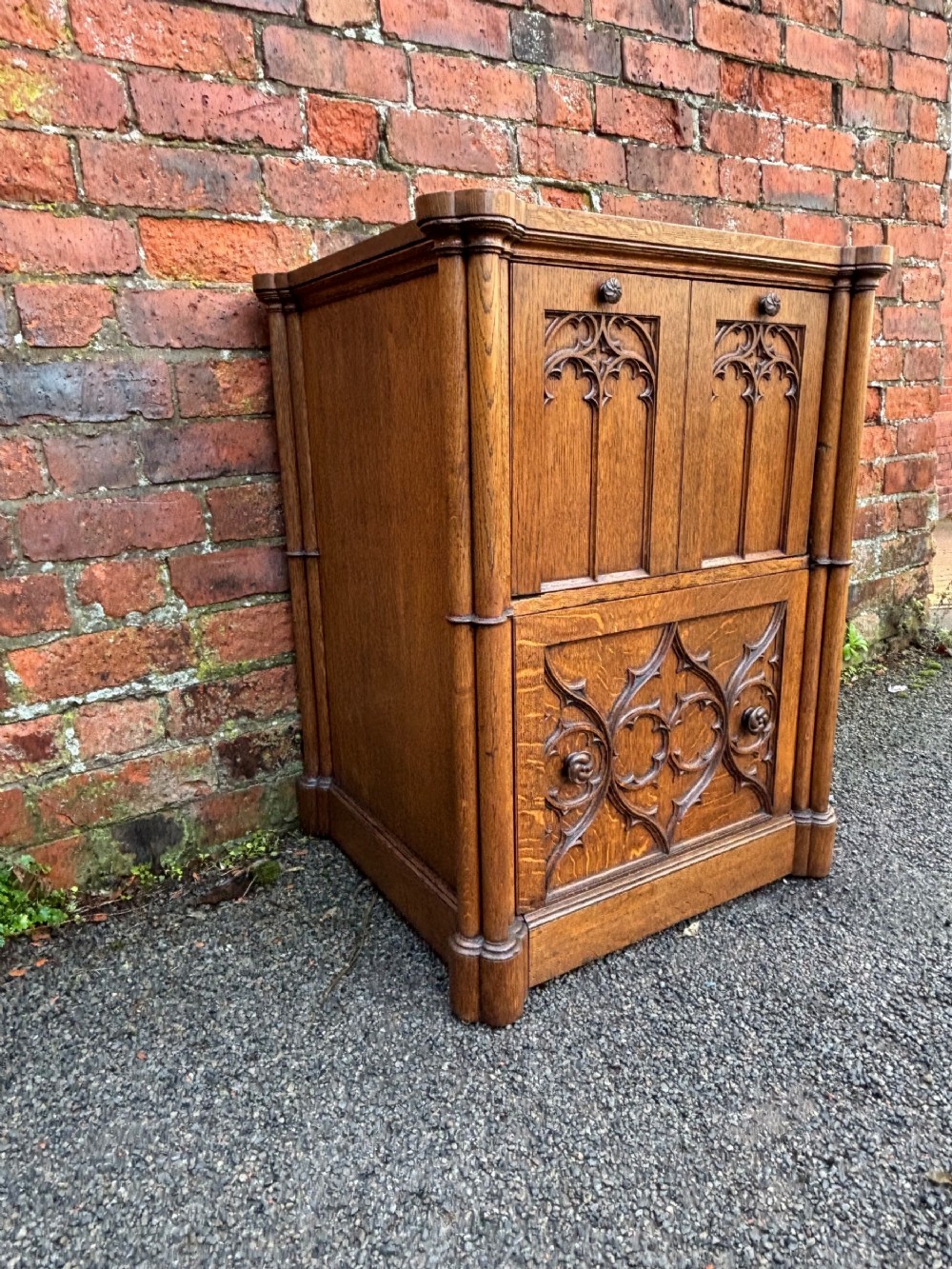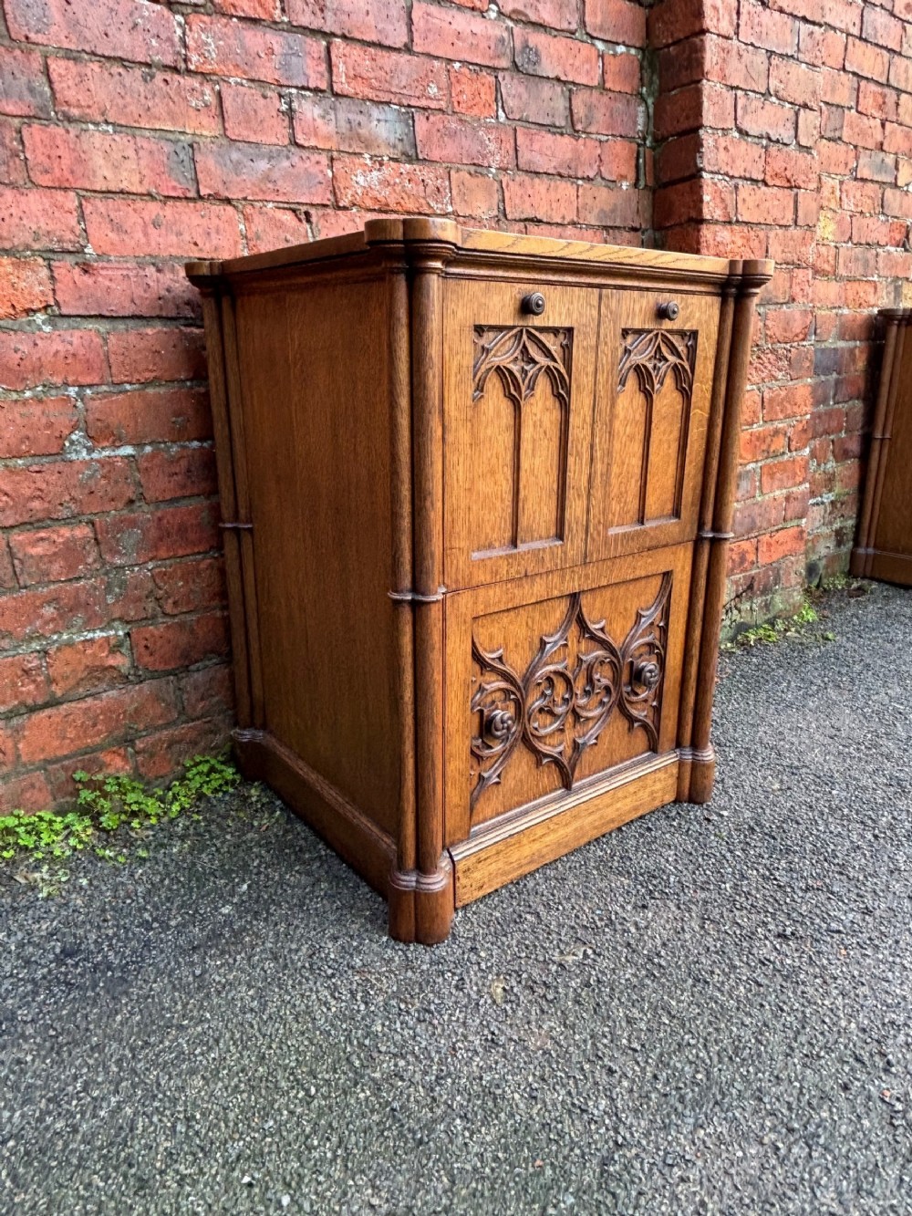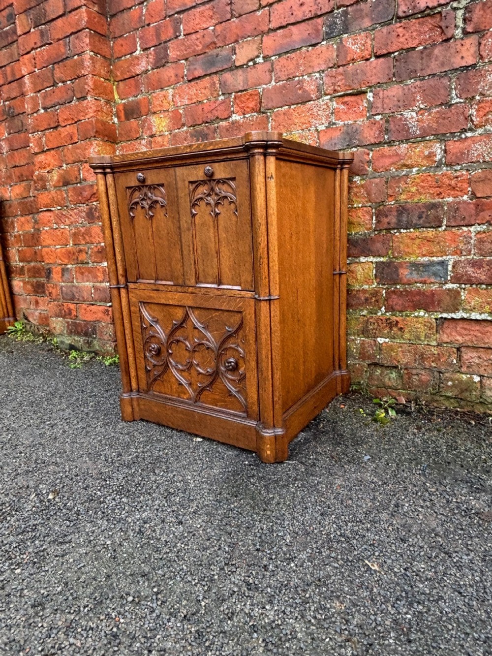 A pair of oversized 19th century gothic revival oak regency bedsides, quite a rare find.