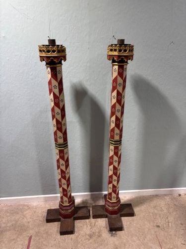 A pair of early 20th century Gothic revival painted candlesticks, can be wired for lamps.