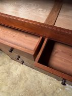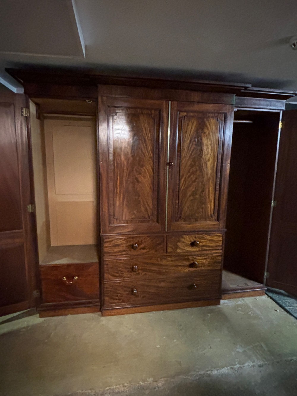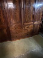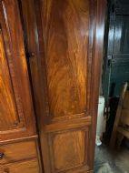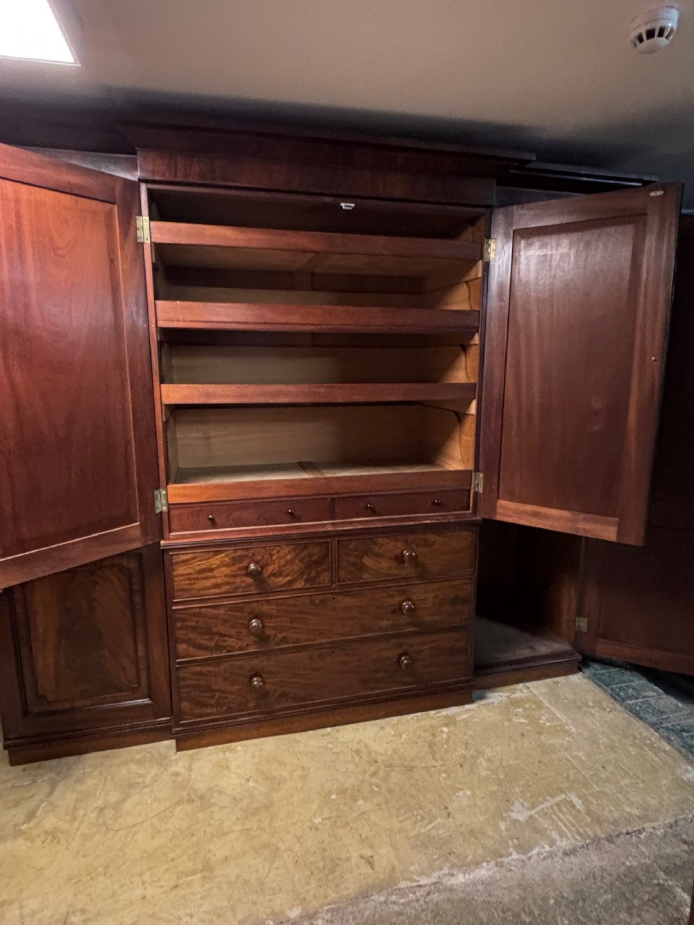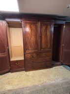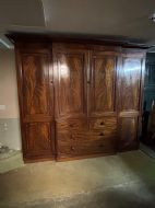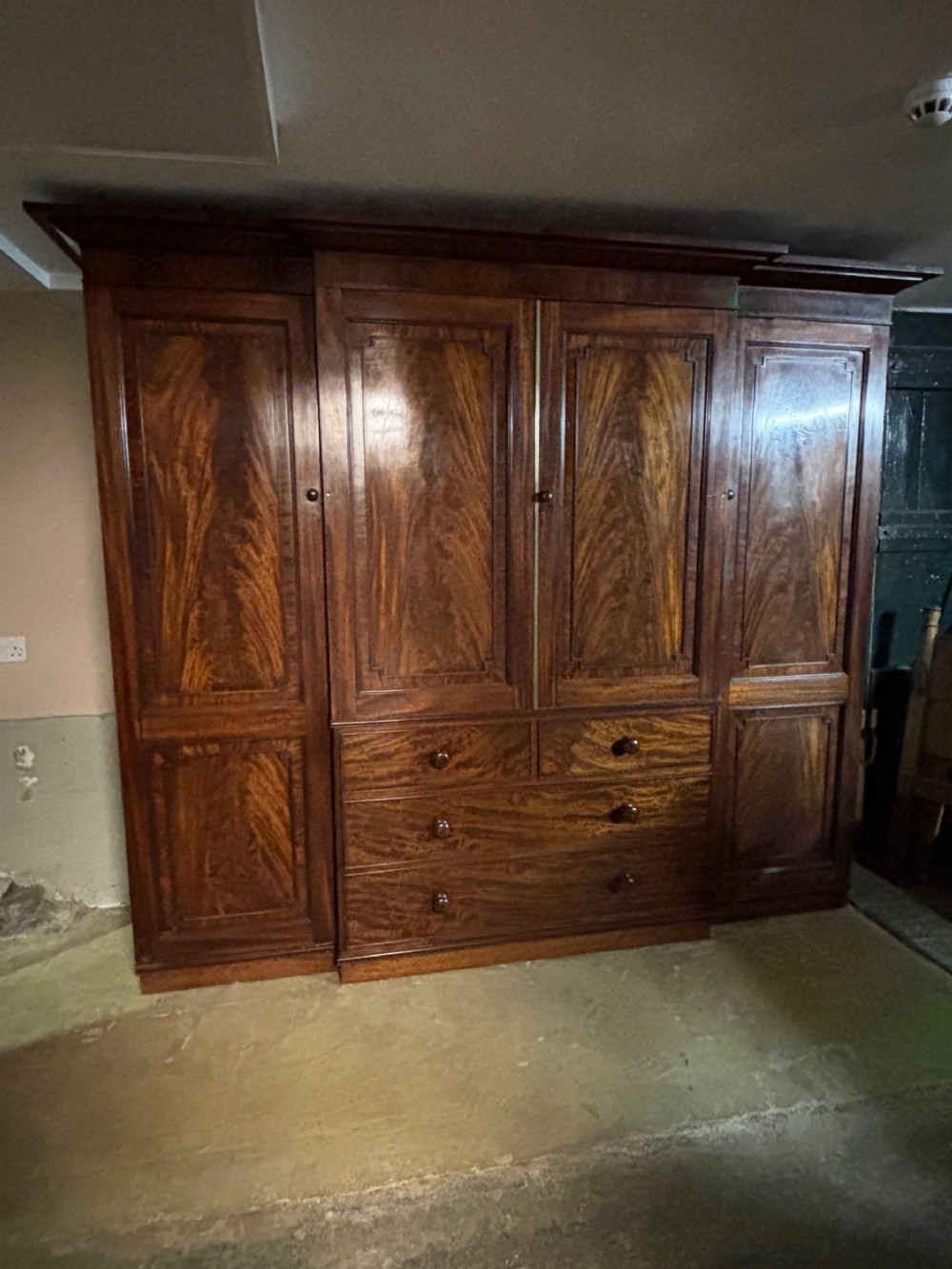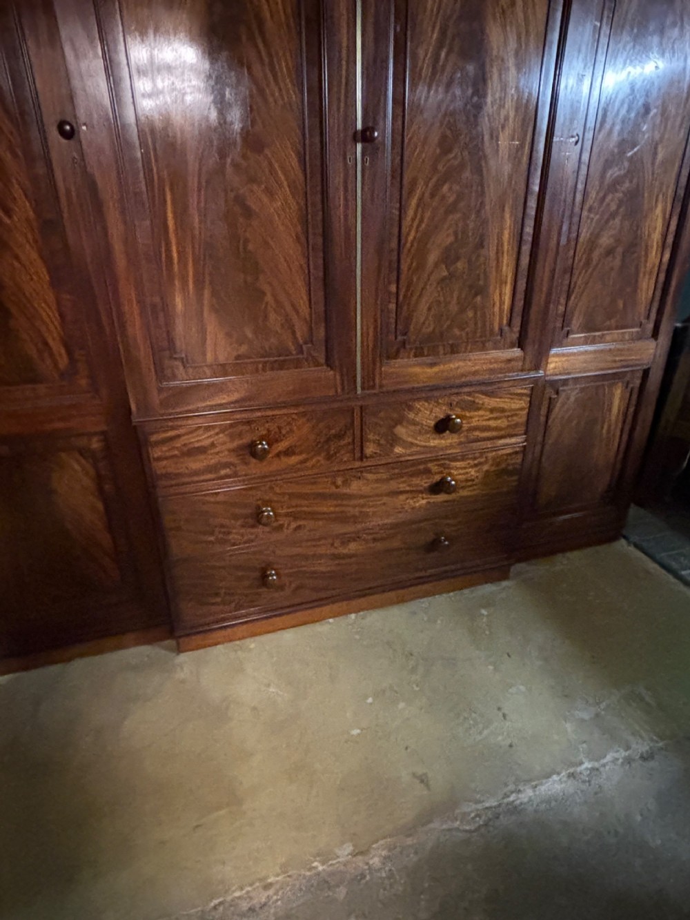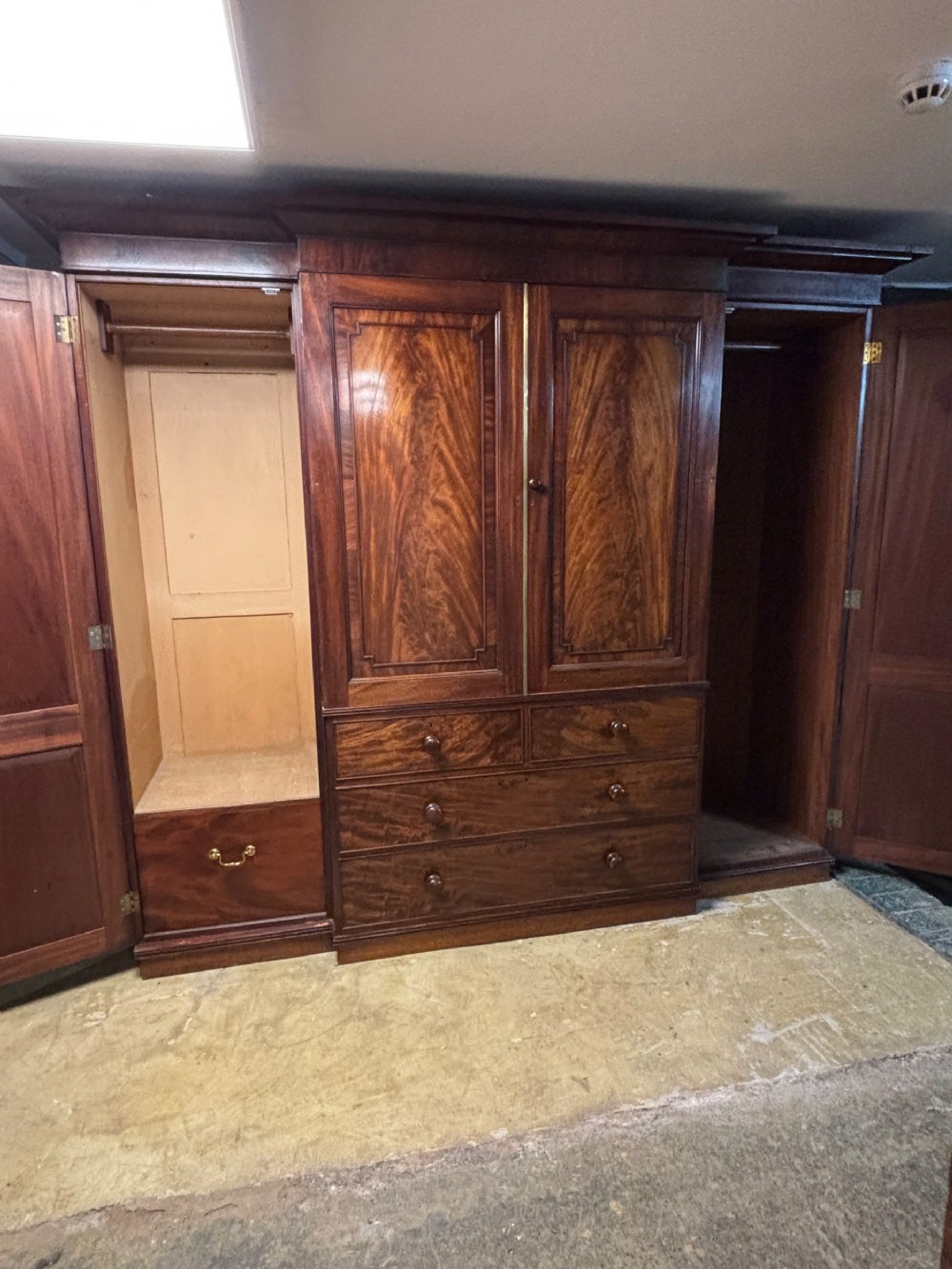 A wonderful quality regency flamed mahogany breakfront wardrobe, the centre section with press cupboard doors in front of sliding trays and chest below, flanked by two cupboards for hanging garments, all a wonderful rich flamed mahogany of the best quality timber.