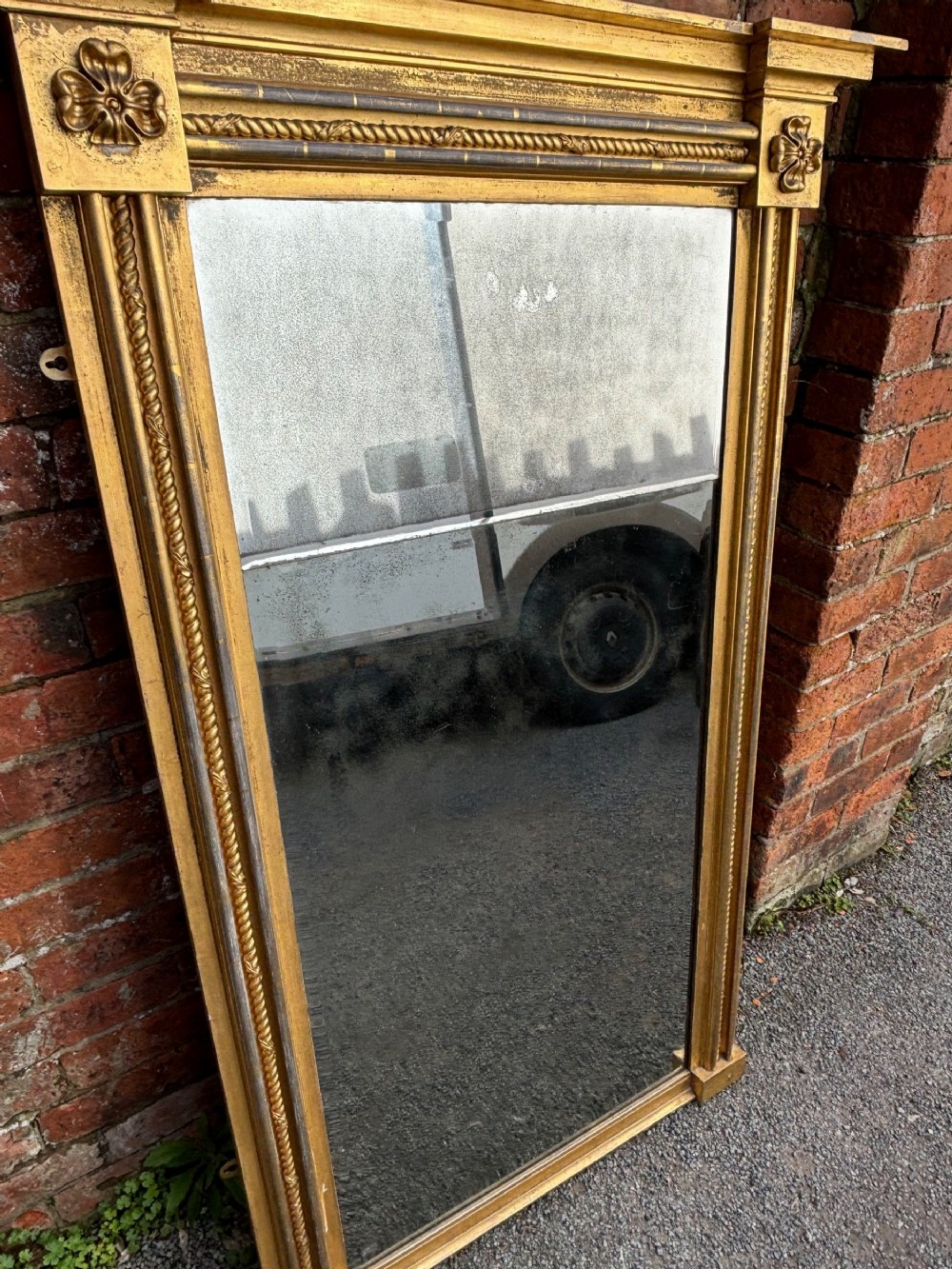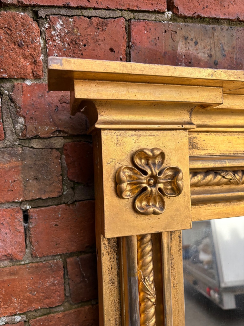 A very close pair of Geo IV 19th century carved & giltwood pier mirrors, one mirror has a single plate mirror glass the other has two plates of mirror glass.